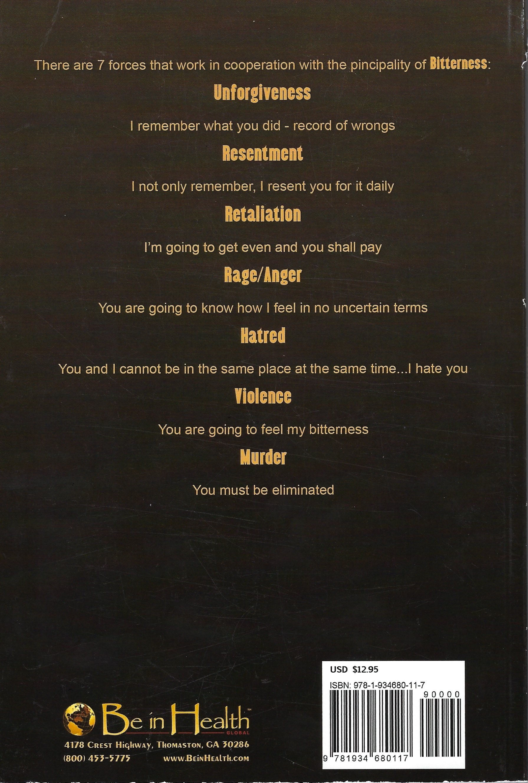 There are 7 forces that work in cooperation with the principality of Bitterness: UNFORGIVENESS I remember what you did - record of wrongs RESENTMENT I not only remember, I resent you for it daily RETALIATION I'm going to get even and you shall pay RAGE/ANGER You are going to know how I feel in no uncertain terms HATRED You and I cannot be in the same place at the same time...I hate you VIOLENCE You are going to feel my bitterness MURDER You must be eliminated - Additional Information