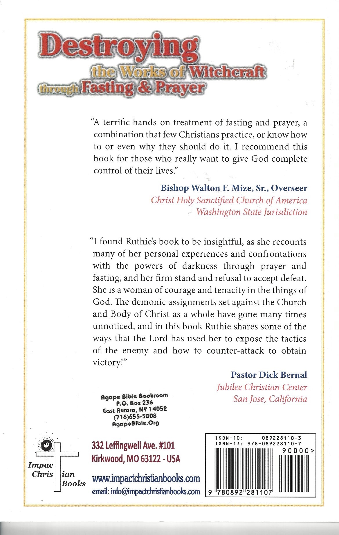 "I found Ruthie's book to be insightful, as she recounts many of her personal experiences and confrontations with the powers of darkness through prayer and fasting, and her firm stand and refusal to accept defeat. She is a woman of courage and tenacity in the things of God. the demonic assignments set against the Church and Body of Christ as a whole have gone many times unnoticed, and in this book Ruthie shares some of the ways that the Lord has used her to expose the tactics of the enemy and how to counter-attack to obtain victory!" Pastor Dick Bernal, Jubilee Christian Center, San Jose, California.