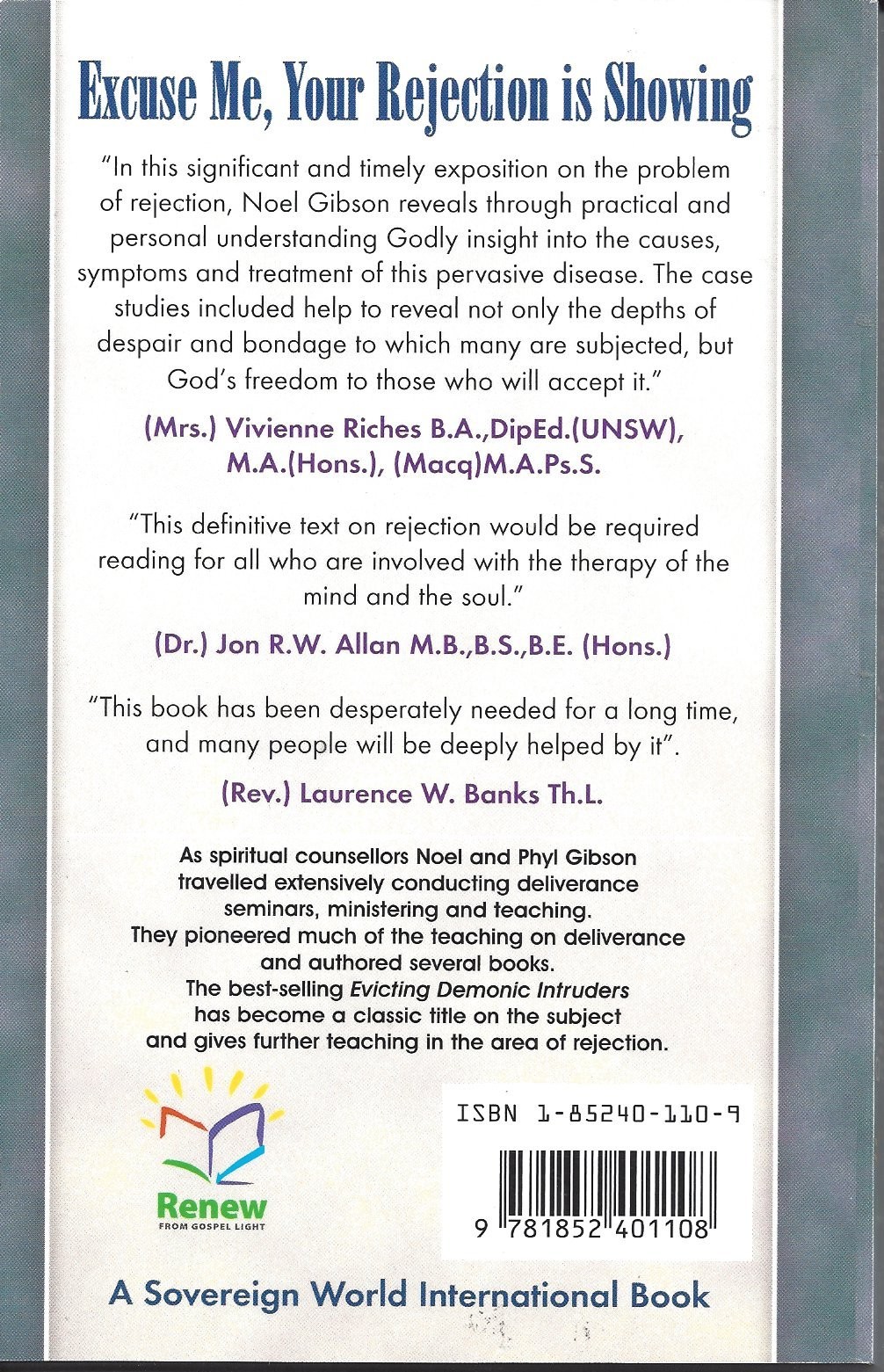 This significant and timely exposition on the problem of rejection, Noel Gibson reveals through practical and personal understanding Godly insight into the causes, symptoms and treatment of this pervasive disease. The case studies included help to reveal not only the depths of despair and bondage to which many are subjected, but God's freedom to those who will accept it. - Additional Information