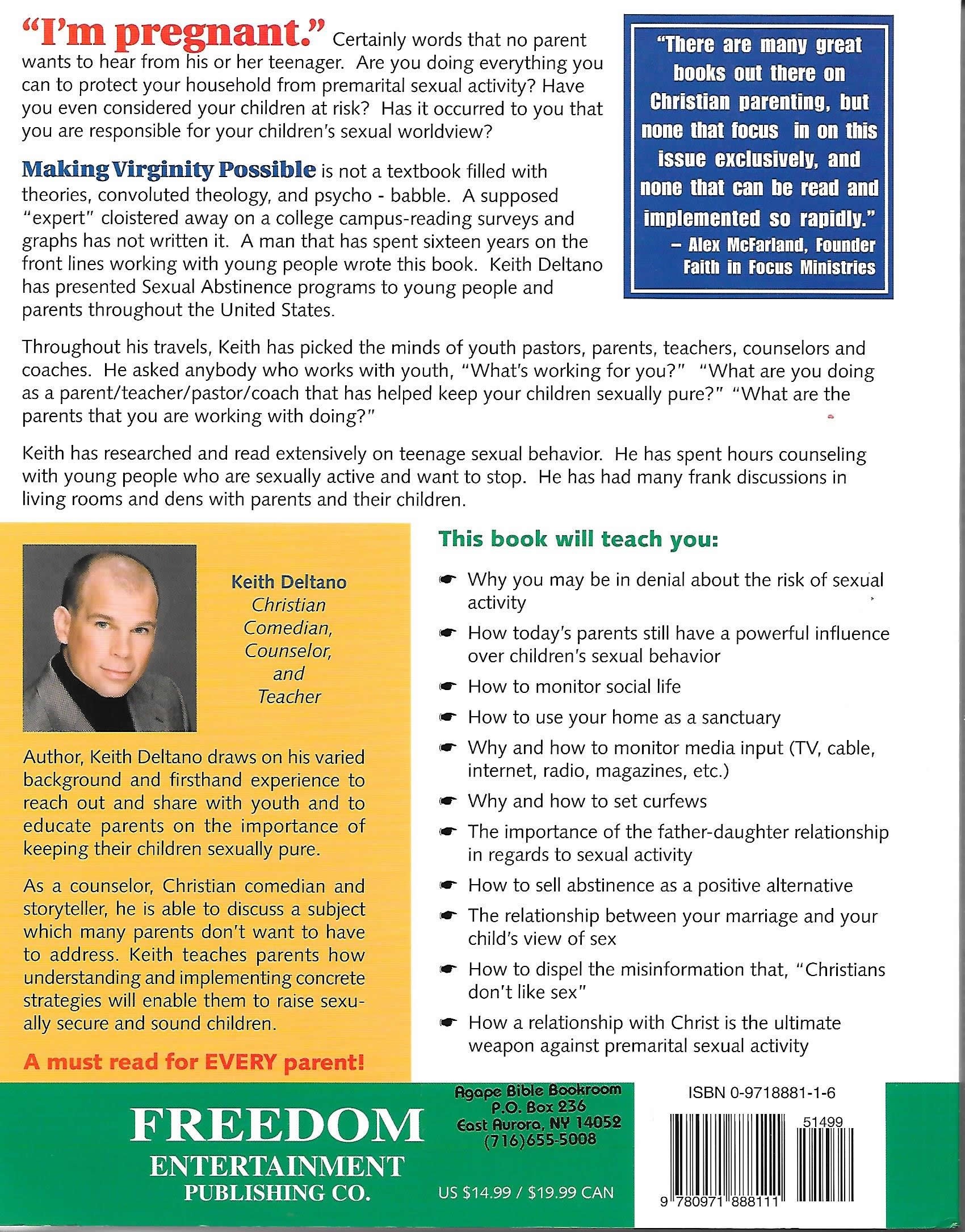 Making Virginity Possible is not a textbook filled with theories, convoluted theology, and psycho - babble. A man that has spent sixteen years on the front lines working with young people wrote this book. Keith Deltano has presented Sexual Abstinence programs to young people and parents throughout the United States. Author, Keith Deltano draws on his varied background and firsthand experience to reach out and share with the youth and to educate parents on the importance of keeping their children sexually pure. As a counselor, Christian comedian and storyteller, he is able to discuss a subject which many parents don't want to have to address. Keith teaches parents how understanding and implementing concrete strategies will enable them to raise sexually secure and sound children.