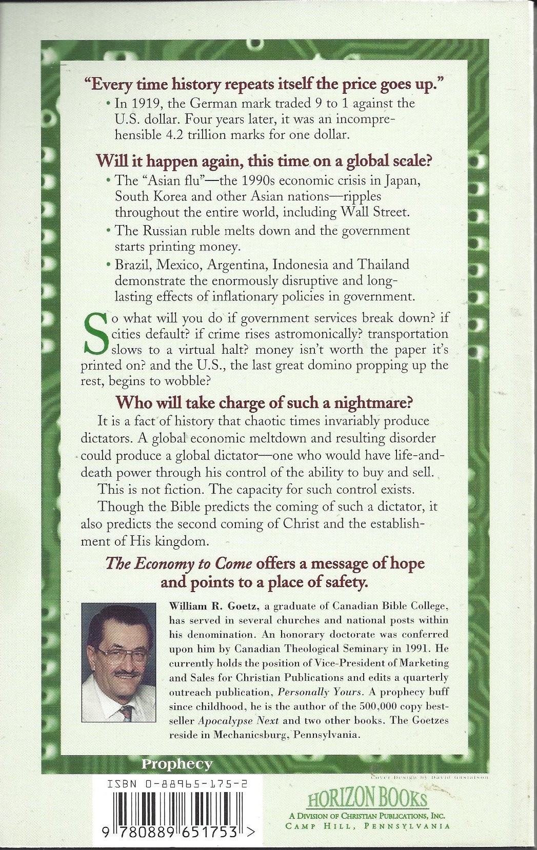 Who will take charge of such a nightmare? It is a fact of history that chaotic times invariably produce dictators. A global economic meltdown and resulting disorder could produce a global dictator - one who would have life-and-death power through his control of the ability to buy and sell. The Bible predicts the coming of such a dictator, it also predict the second coming of Christ. The Economy To Come offers a message of hope and points to a place of safety.